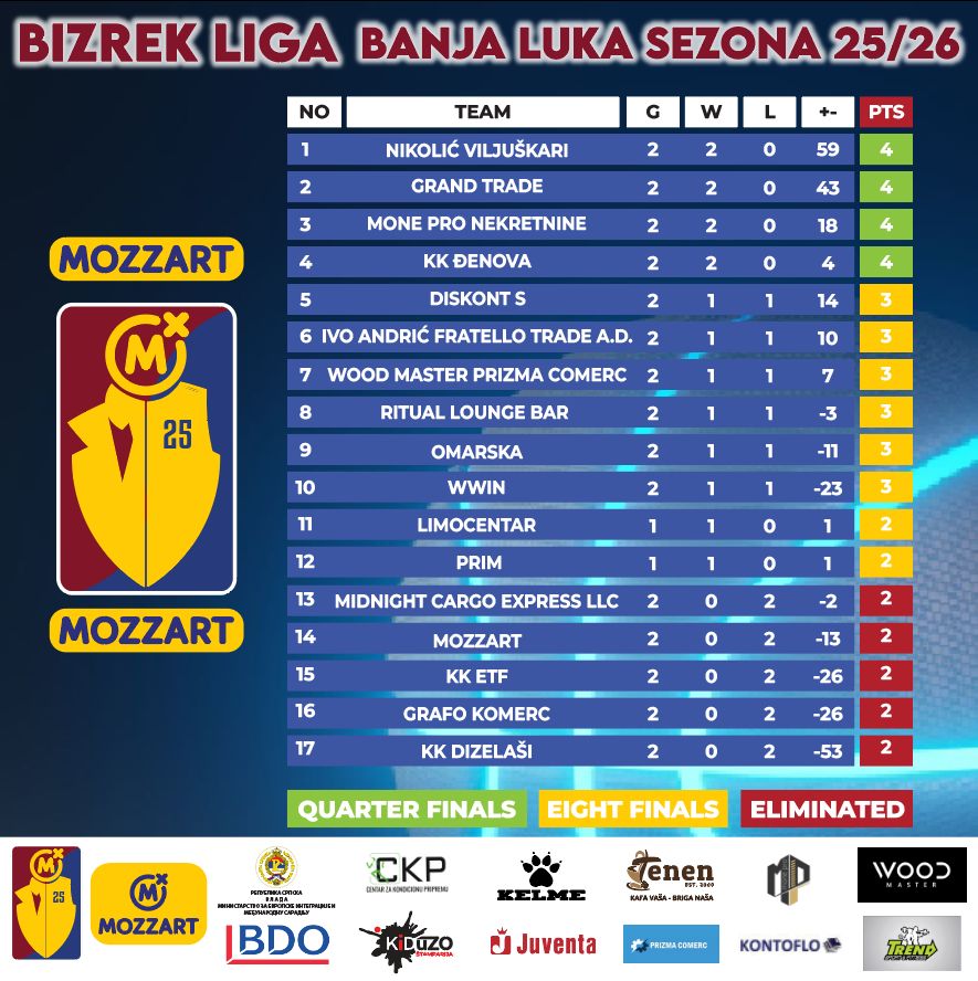 Za vikend je odigrano drugo kolo Mozzart BizRek Lige Banjaluke, a obilježila ga je odlična igra ekipe Grand Trade, koja je upisala sigurnu pobjedu nad timom WWIN rezultatom 68:40, te sjajna partija Andreja Mikeša, koji je proglašen za MVP-a kola.